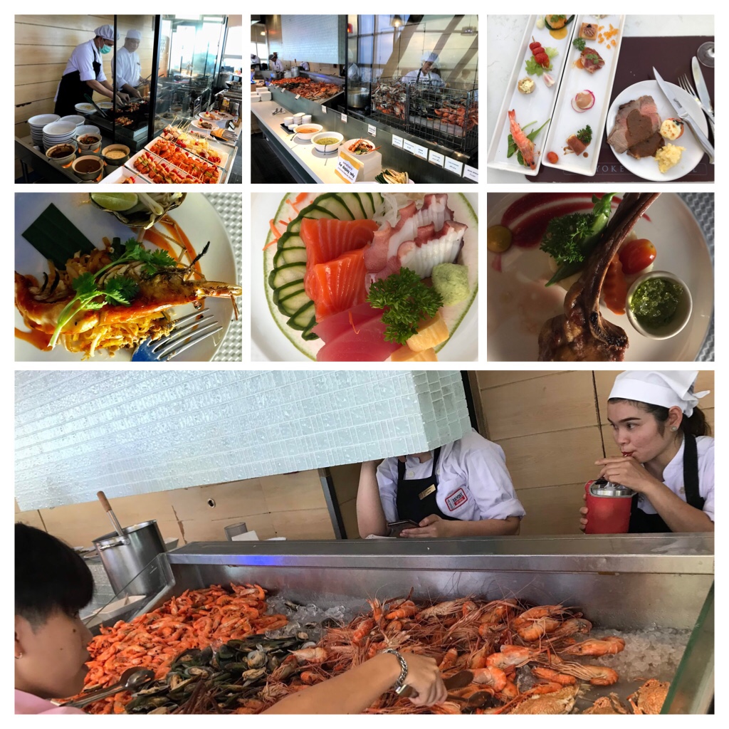 The buffet inside was extensive … featuring Thai, seafood, bbq, salads, and desserts. In addition well trained waiters delivered appetizers, salad, soup, sushi, main course, and fruit to us on the balcony during the evening. You couldn’t go hungry here! There was a huge amount of seafood. The crab seemed to be especially popular. If only I was not allergic to crab!
