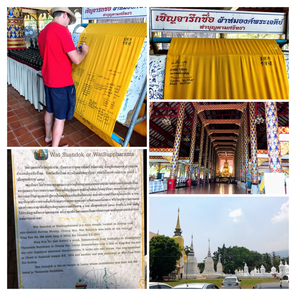 There is a visiting entrance fee of 20 Baht for non Thai visitors. There are lots of different types of fundraising you can contribute too—from orphanages, to sick, elderly, etc. We were able to sign our names on some new curtains that were being hung in the Wat soon.