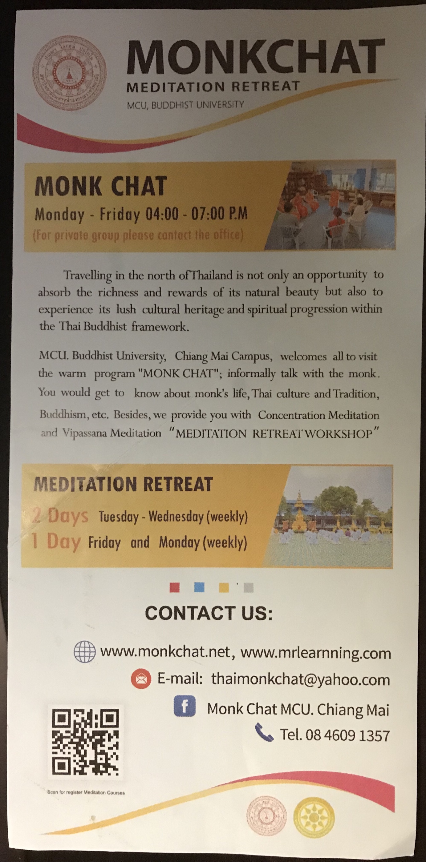 I participated in the Monk Chat last visit and learned lots about the life and experiences of monks during my previous visit to Chiang Mai. Next time we want to try the meditation retreat.