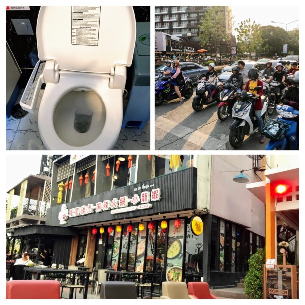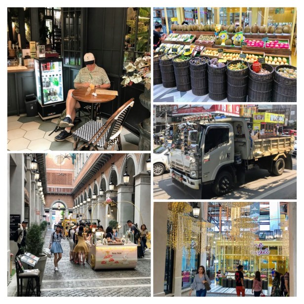 The weather returned to sunny and 40 degrees (before humidity), so air conditioned malls sounded appealing. We noticed there were more young people in this area, fancier vehicles, (check out all the mirrors on the truck!), and lots of clothing and coffee shops. Also… check out the Botox and skin whitening ads above Clover pharmaceutical.