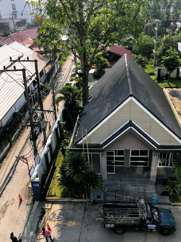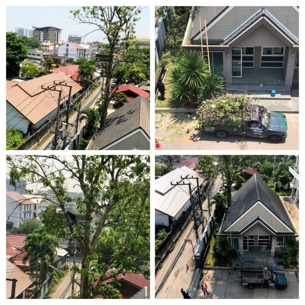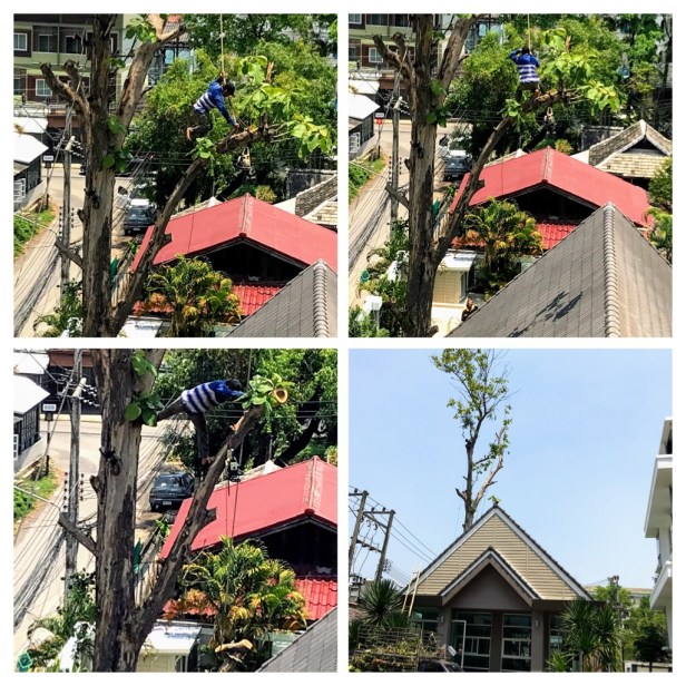 This morning we woke up to the sound of chainsaws. We shook our heads as this was common on Vancouver Island, but new to us in Thailand! Upon opening our 5th floor curtains, we discovered a man standing barefoot in the massive tree above the pool area immediately in front of us.
