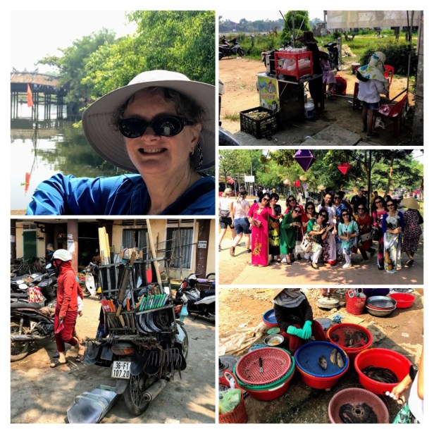 We took our first stretch break by the rice fields and duck ponds dodging a tractor which happened to cross the narrow back road as we were chatting together. We continued on our adventure to Thanh Toan where many local Vietnamese were visiting the 18th century famous bridge, the market, and the neighboring village.