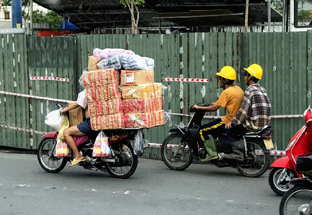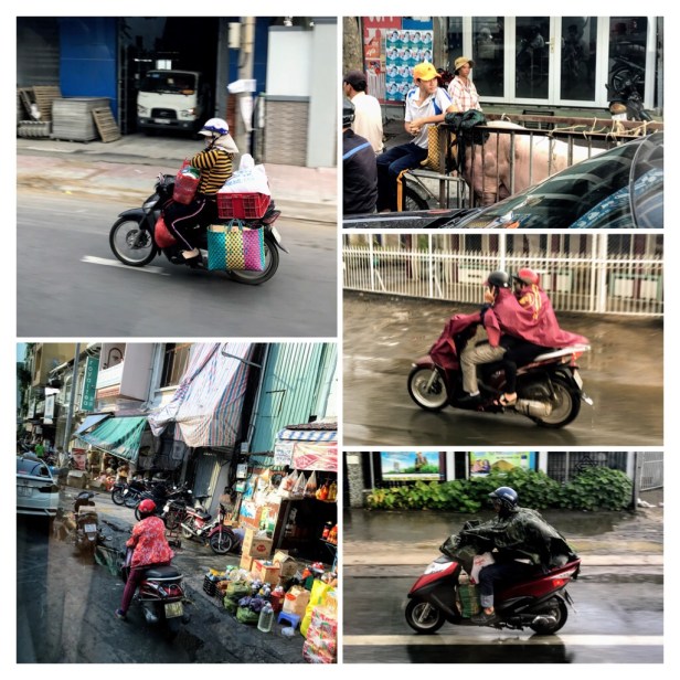 During the bus trip back to Ho Chi Minh City, we saw many more motorcycles with unique loads–even one pulling a huge live pig! It was raining and the ponchos were out!