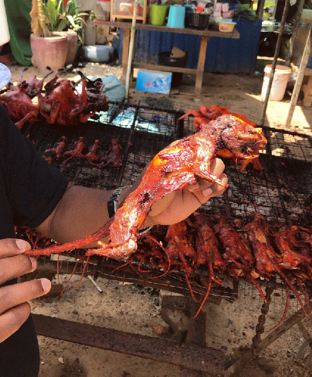 En route to Siem Reap we stopped at Sareth’s favorite roadside stop at O Taki. Strettarea to sample Khmer BBQ foods (well…some tried). My husband decided to sample some rat, but I preferred to sample a very chewy frog!