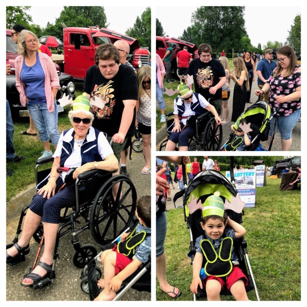 Mom’s legs can not support her walking far, so my nephew Brody offered to push his nana throughout the grassy hills in a wheelchair. My niece, Kiersten pushed the stroller as Elijah ogled the trains and multitude of vehicles.