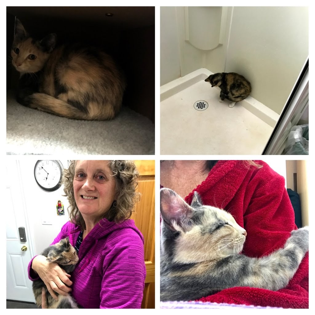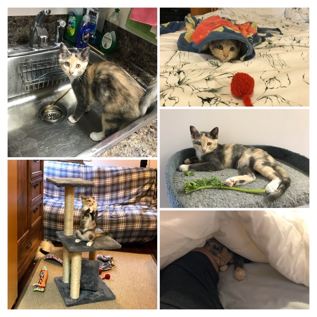Her snuggles are becoming more frequent and she truly melts our hearts. One moment she is fascinated watching water drip through a drain, the next she is burrowing and hiding.