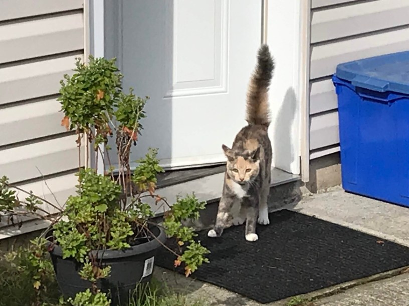 Based on estimates from several veterinarians, Sophia’s probable birth was late May. We adopted this little rescue kitten when she was approximately 7 weeks of age after she was discovered in the woods near Port McNeill on northern Vancouver Island. Sophia’s markings are quite unique and gorgeous. Her cat coloring is classified as a blue diluted Tortie with white.