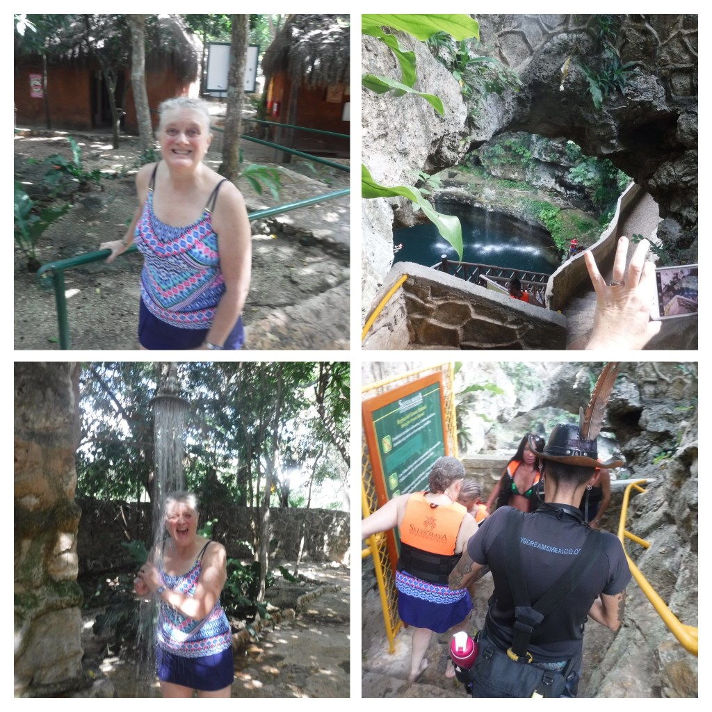 The beautiful, soothing swim in the cenote was complete with catfish, dripping waterfalls, and a dive platform.