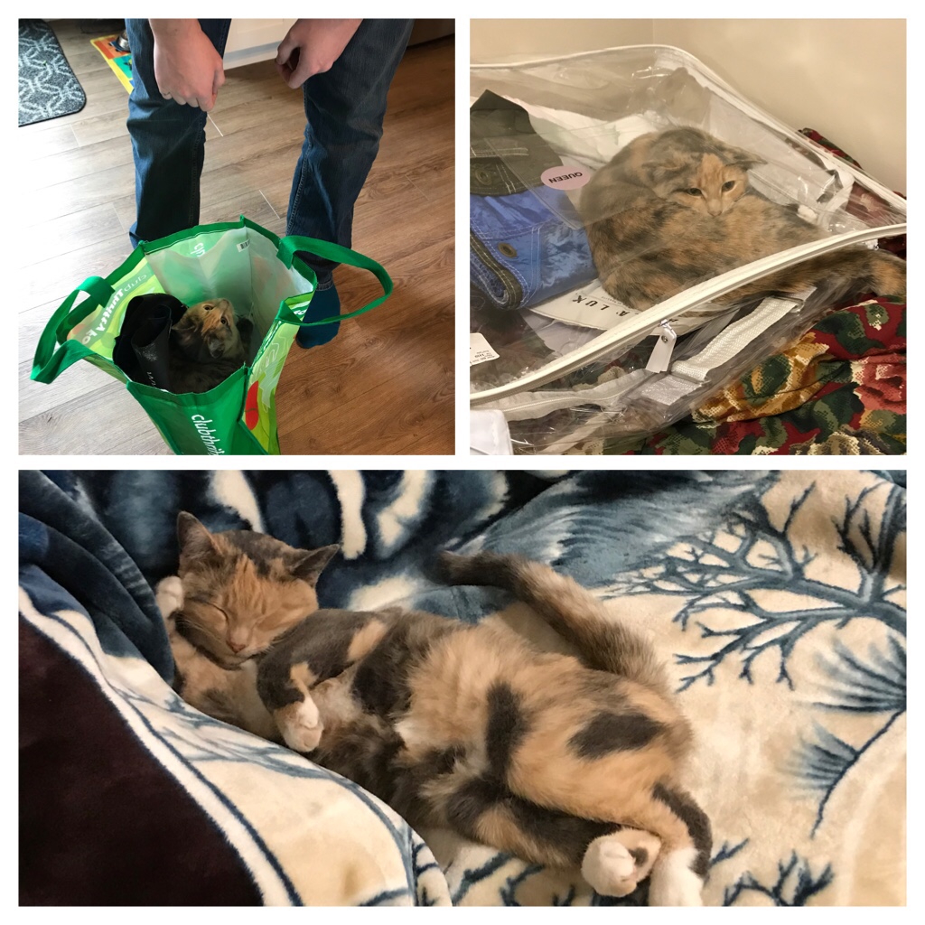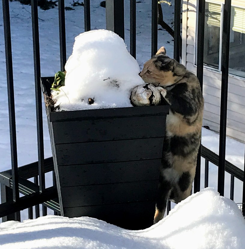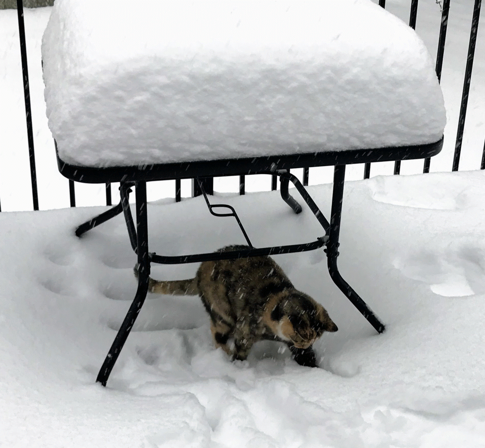 Sophia had mixed reactions during the snowfall time. She was very curious often watching the snow fall from the doorway, but she also increased her burrowing activity hiding in bags and strange locations.