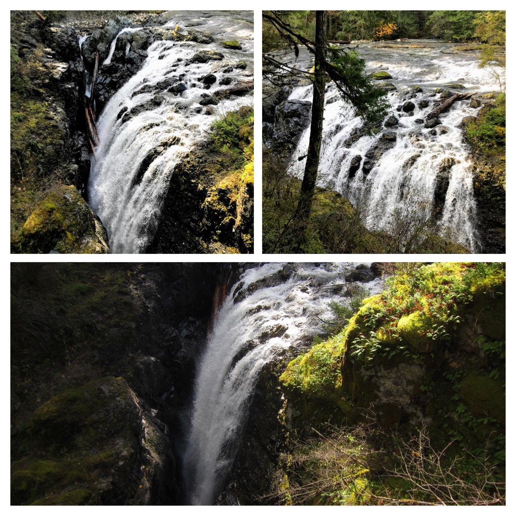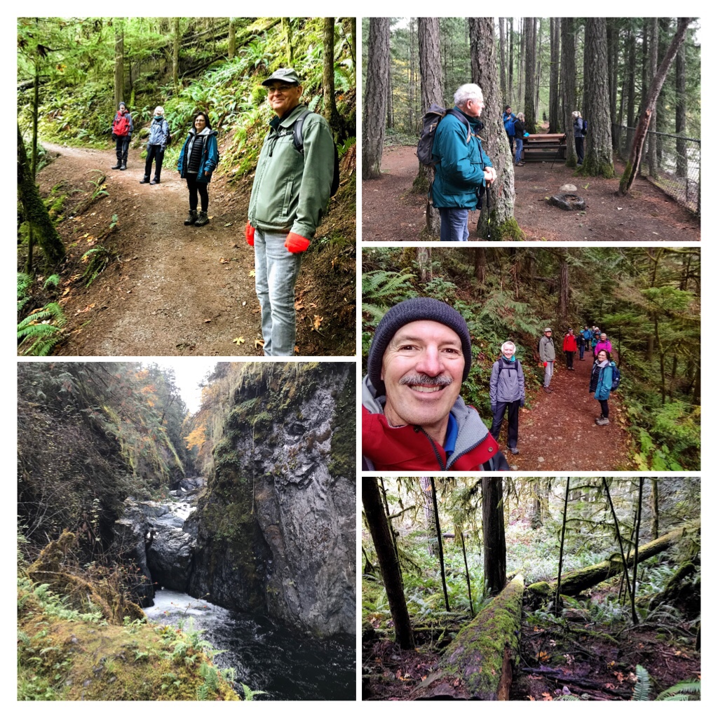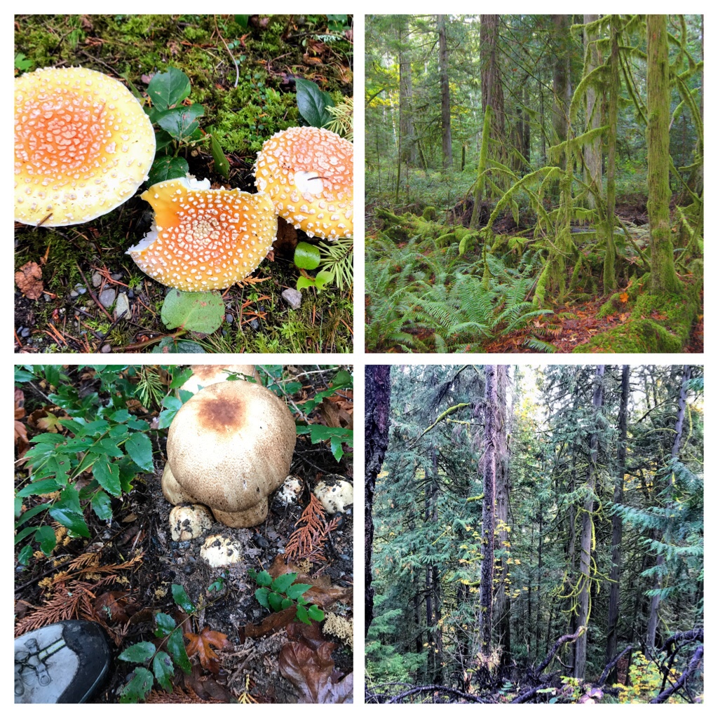 The following photos illustrate the richness in green growth, increased levels of water, and presence of mushrooms and fungi during autumn (October) on the Englishman River Falls trails.