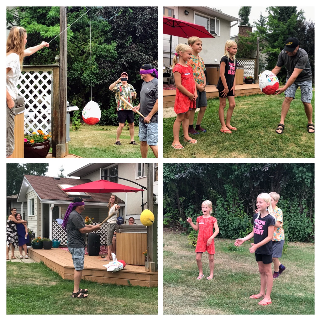 Matt, Andi, and their gorgeous daughters had created a surprise for Mark! Since they were toddlers Mark had an endless stash of Kinder-surprise eggs as a treat for them. They decided to create a Kinder-Surprise piñata for his enjoyment! Here are a few pictures… there are more in the next video…