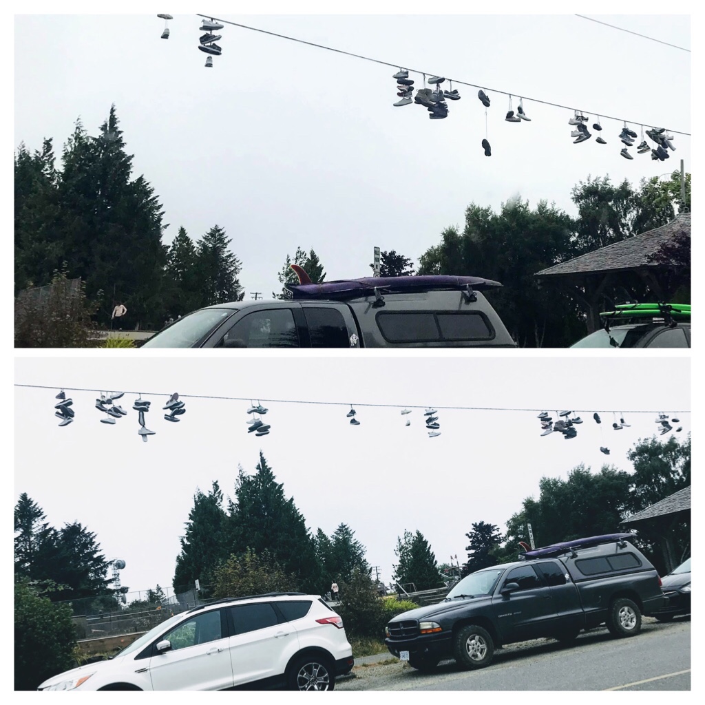 By 6:30 pm the sun had disappeared and the fog was rolling into Tofino. The temperature was dropping quite quickly and was now sitting at 16 degrees C. Tofino has many quirky shops and unique features. There were hundreds of shoes (mainly runners) draped over cable lines around a downtown skatepark.