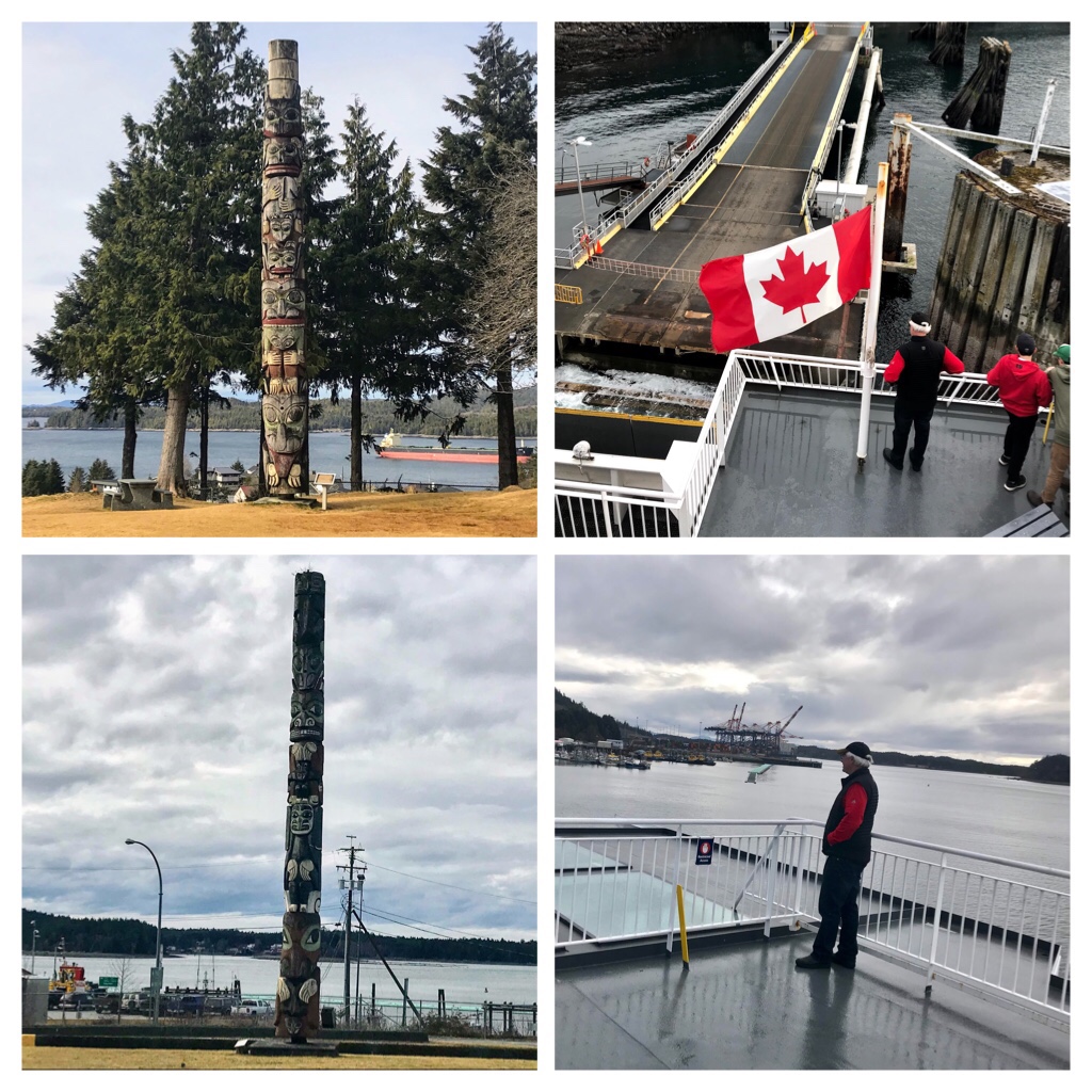 There are totem poles in several locations near the terminal. The dock connecting the B.C. Ferry is fairly lengthy and the way the ferry connects and departs from this dock is worth watching! (From our 2019 trip).