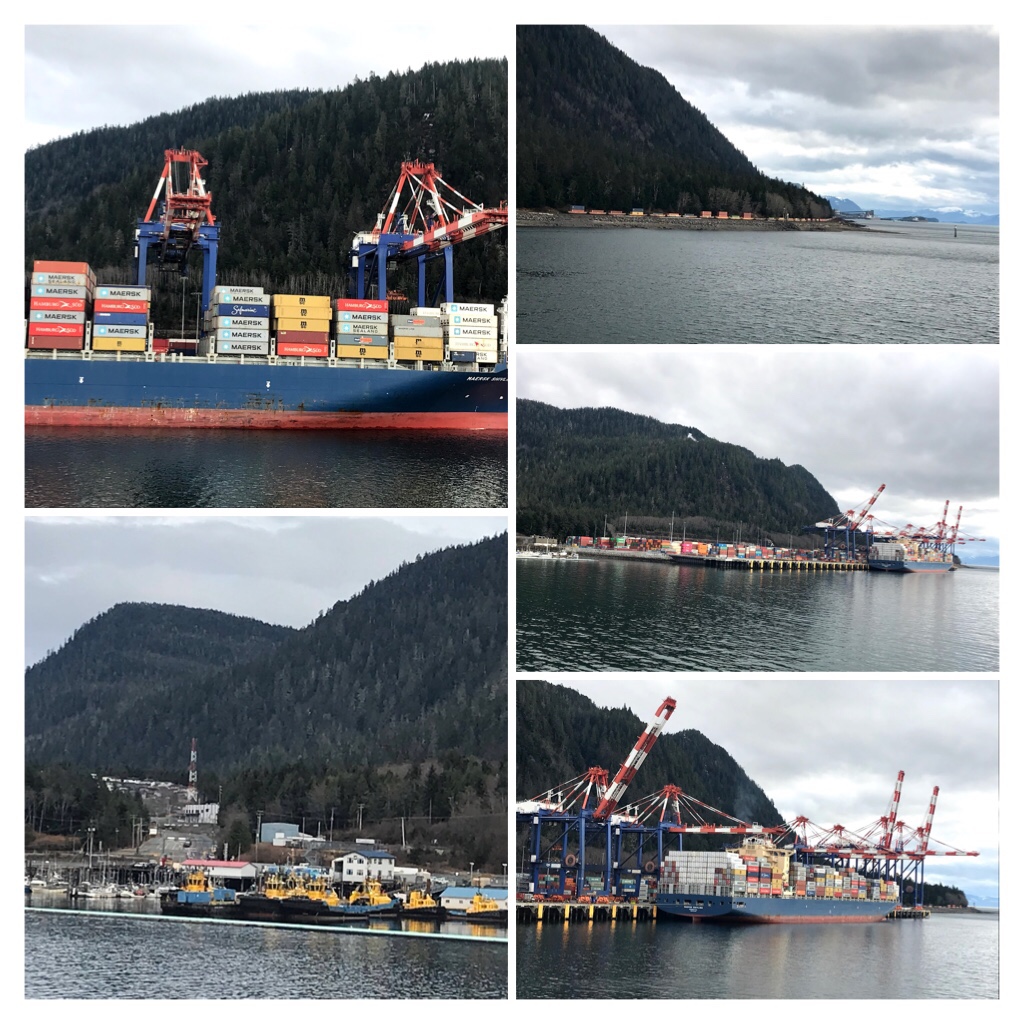 The Prince Rupert harbour is a hectic location. As we departed from the Ferry Terminal we could observe the active CN freight train line, Coast Guard vessels, Commercial Fish Packing plants, Float planes, and stacks of containers being loaded and unloaded onto International freighters that were waiting their turn in the bay.