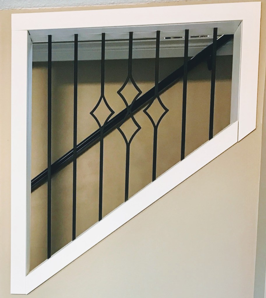 At “Finishing” stores we selected the wood for the stair skirts, new handrails, and trim around the pass-through opening. Wrought iron balusters were selected for inside the opening. The black balusters were a new design featured in the 2021 catalogue. We really liked how the shapes of the balusters complimented the shape of our pass-through opening.