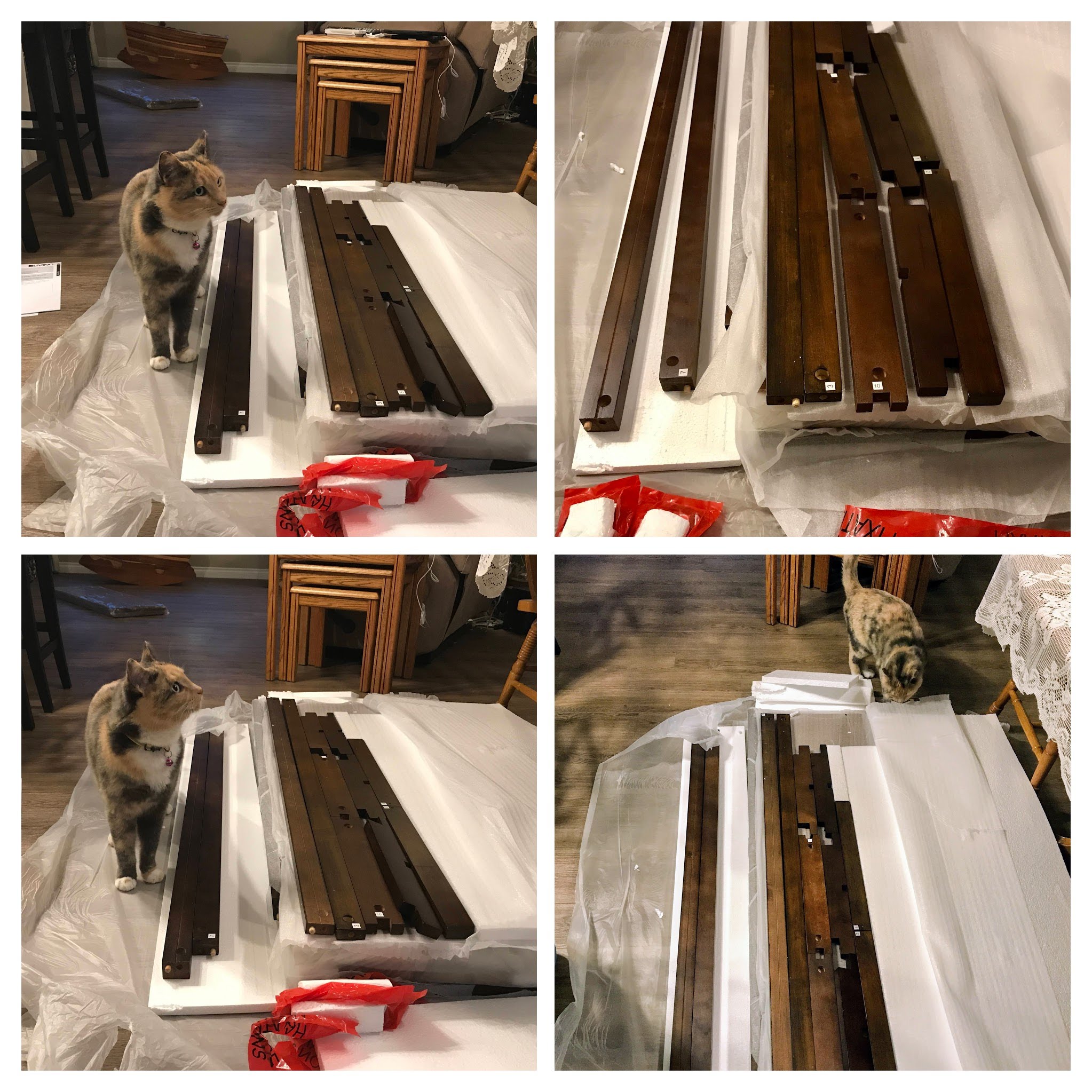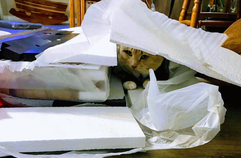 Newly assembled, we moved the storage seat into its new location. Of course, Sophia followed and gave the furniture its final inspection from the sides and front. Luckily, it was too tight when she explored underneath, so this won’t be a new hiding spot. She adores playing tag with us!