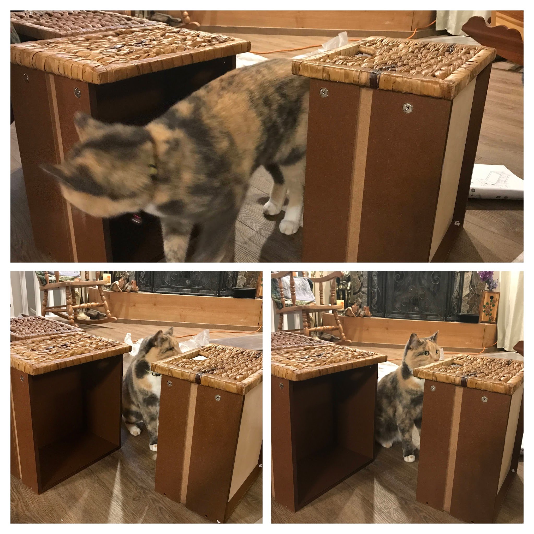 The rattan fronts on the doors seemed to intrigue Sophia and she decided to come closer to the action. She hid inside the bench structure and watched the process–even putting out her paw to assist!