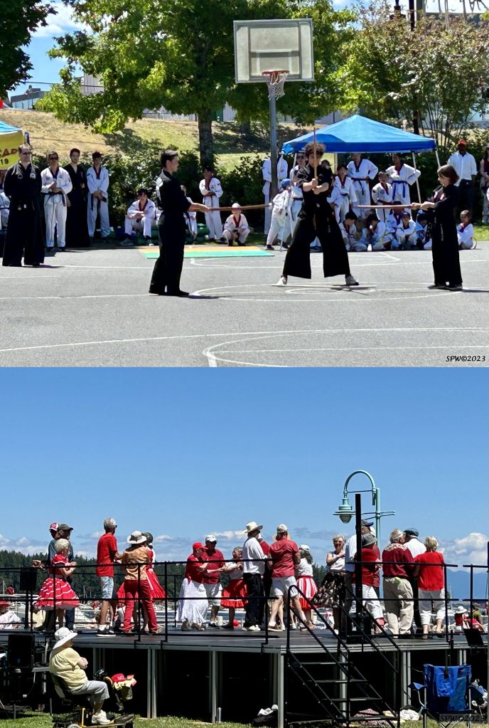 These photos show demonstrations by a martial arts troupe and square dance performers.