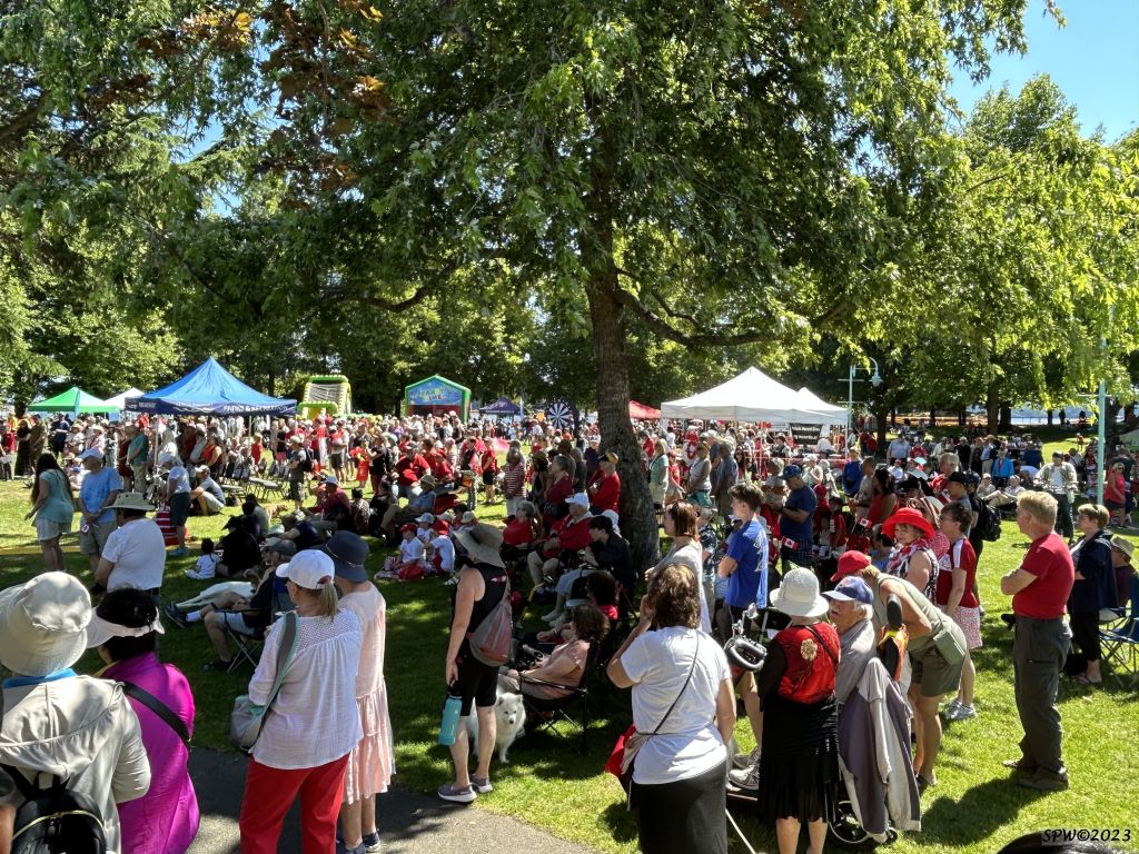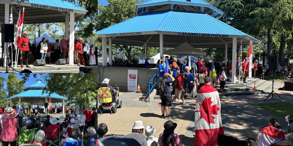 Following the Flag ceremony we gathered at the Maffeo Sutton Pavilion augmented by grassy open spaces, tents, healthy varieties of shade trees, and a glorious view of the Pacific ocean as we bonded together singing our national anthem… Oh Canada!