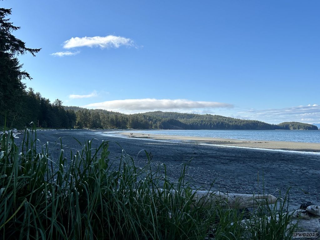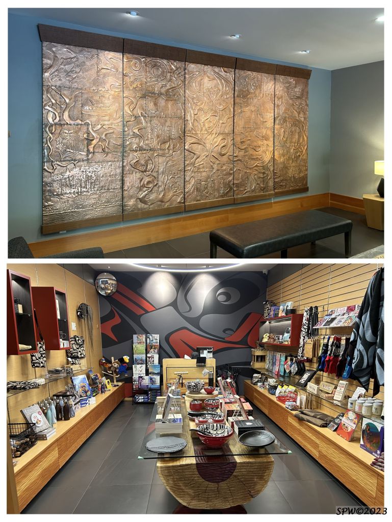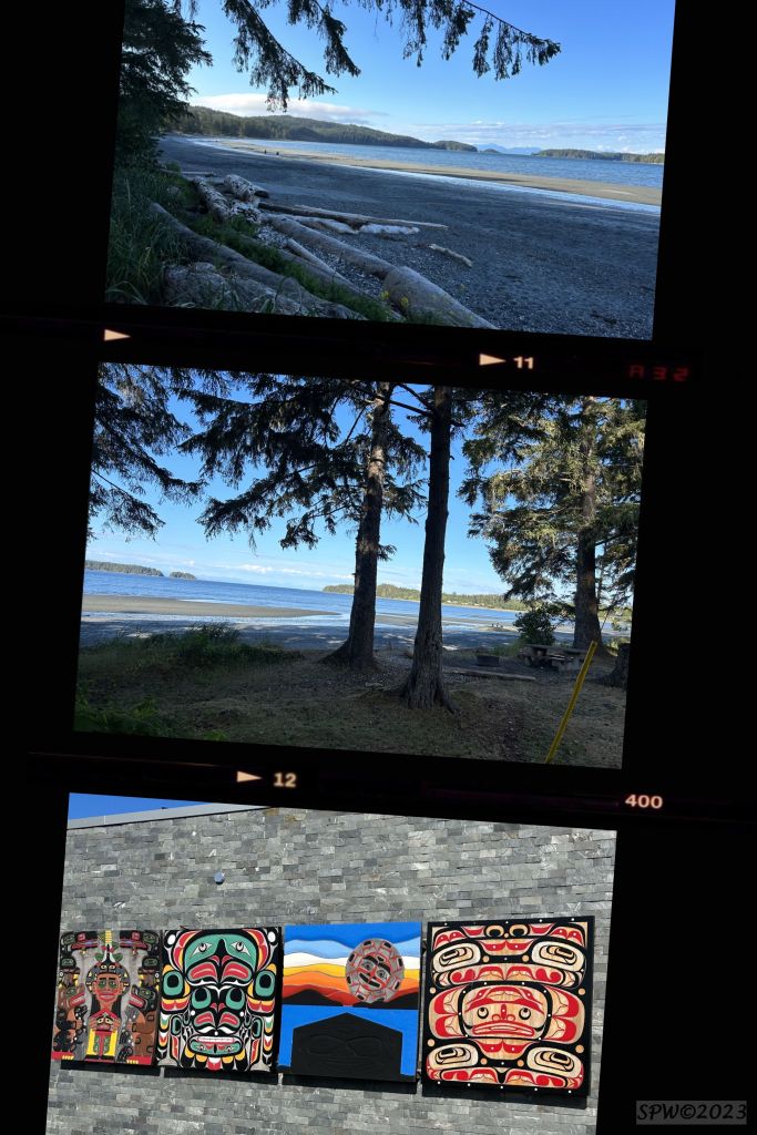 This series of photos were taken mid July 2023 at Port Hardy near Fort Rupert (Kwakwaka’wakw Territory). The top 2 photos are of Storey’s Beach area. It’s a beautiful area to kayak, paddle or explore and we often encounter Pacific white-sided dolphins, Dall’s porpoise, and sometimes the odd whale. The bottom photo is an art display depicting First People’s art and culture which is located at the Port Hardy Airport.