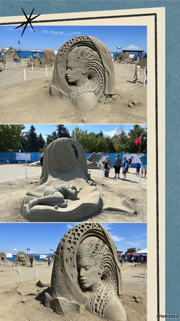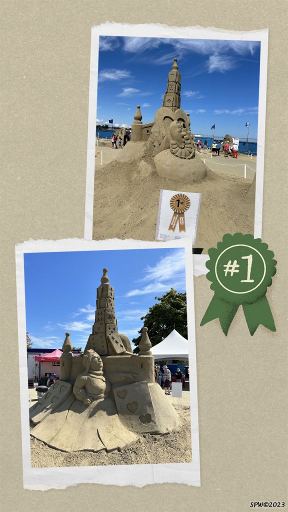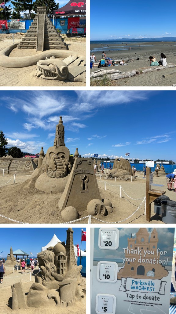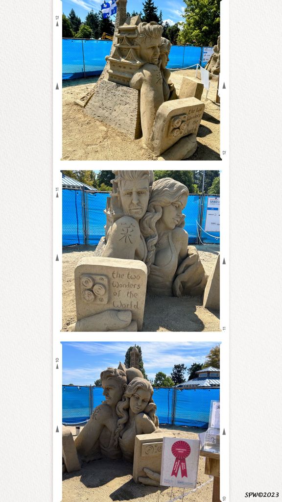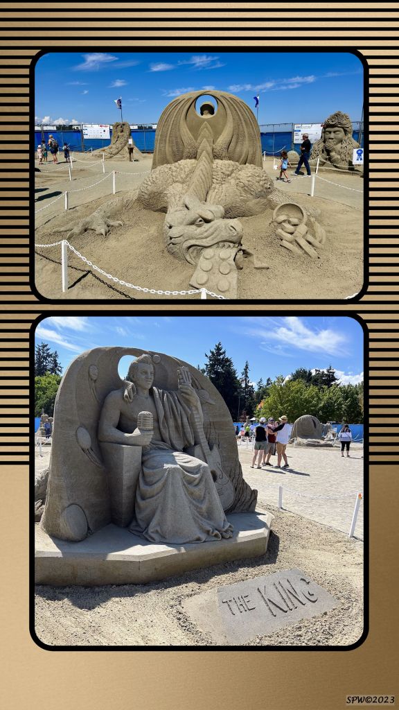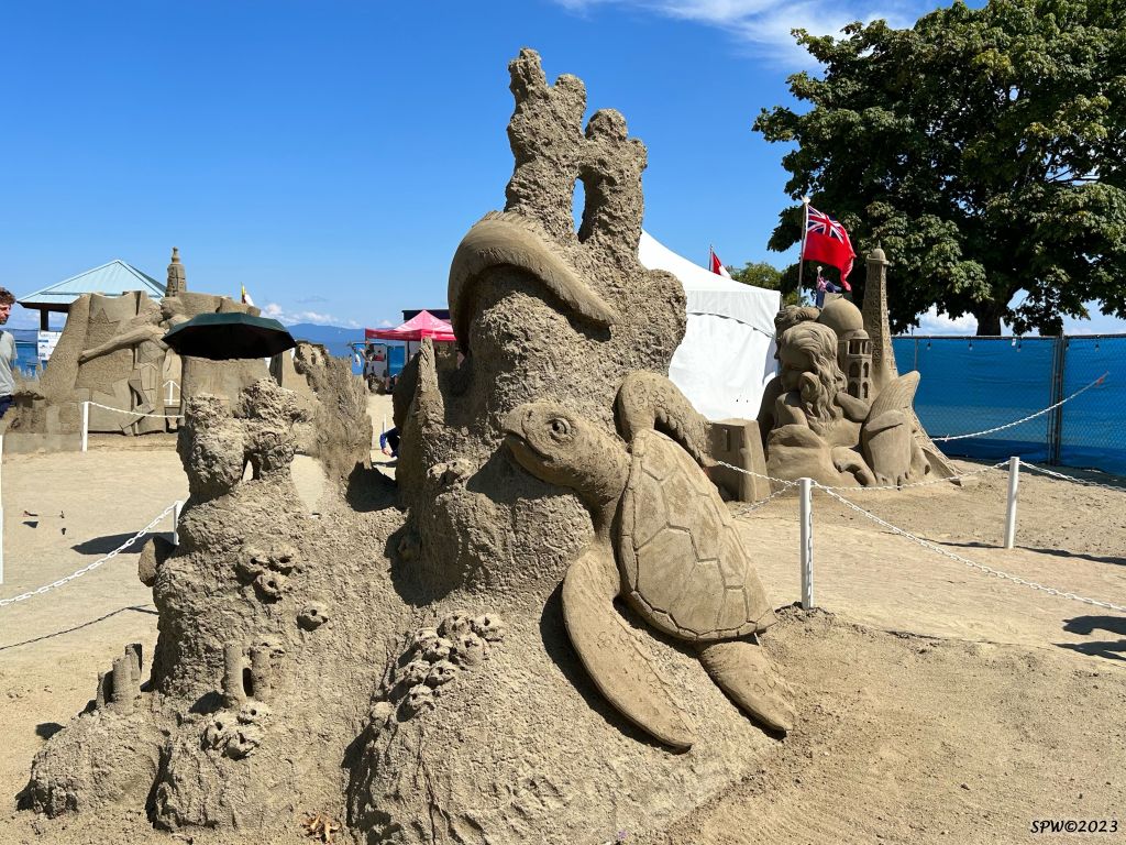 The photos in this blog post were taken during a visit to Parksville in mid August 2023. The location of the sand competition is adjacent to the Parksville beach/boardwalk/park area. The creation of the sculptures occurred from July 13th-16th when artists had 30 hours to create their elaborate sand interpretations. There are two main categories artists may select–solo or doubles.